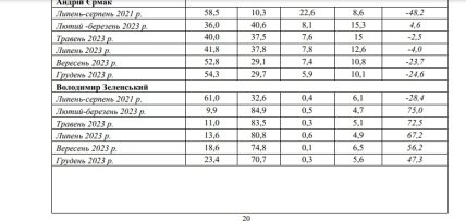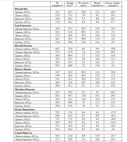 Чаще выражали доверие, чем недоверие, к А. Данилову (соответственно 44% и 30%), В. Малюку (соответственно 41% и 21%), Р. Умерову (соответственно 35% и 22%), И. Клименко (соответственно 31 % и 21%).
