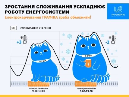 Там также проиллюстрировали увеличение потребления с учетом падения столбиков термометра. Поскольку график за день напоминает кота, уши которого указывают на пиковые моменты потребления, то в "Укрэнерго" используют аналогию с этим домашним животным для того, чтобы наглядно показать суточные изменения.