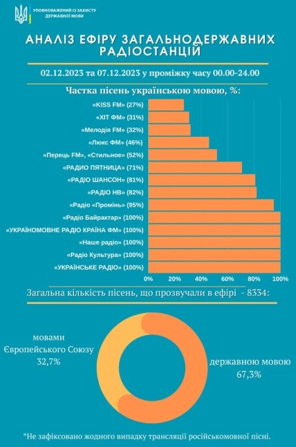 Об этом сообщил языковой омбудсмен Тарас Кремень. Были проанализированы круглосуточные эфиры 2 и 7 декабря 2023 года всех радиостанций, вещающих на всю страну.