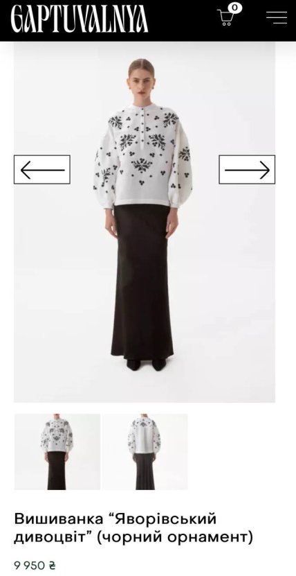На сайте Gaptuvalnya говорится, что ее орнамент вдохновлен "красотой и самобытностью яворовского платка". Купить такую же можно по цене в почти 10 тысяч гривен.