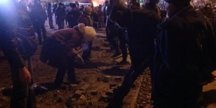 На ул. Грушевского в Киеве протестующие разбирают брусчатку.
