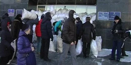 Утром группа людей забаррикадировала дверь административного здания мешками со снегом. Протестующие таким образом хотели не допустить работников в помещения Сумской областной администрации и городского совета. Это является нарушением действующего законодательства, сообщают правоохранители и за подобные деяния, согласно Уголовному Кодексу Украины предусмотрено наказание.