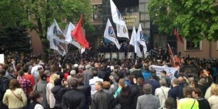 Толпа пророссийски настроенных лиц с георгиевскими ленточками захватила здание областной прокуратуры в Донецке.