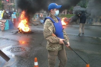На Крещатике пока горят два костра - где-то по 10 шин в каждом. Покрышки периодически добавляют. Постоянно возникают споры с прохожими, которые не одобряют того, что происходит.