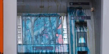 Разбив вывеску и оставив несколько надписей на фасаде " Рассія, go home!" и "Водки нет!", люди поехали на перекресток Киевской и Хлебной, где расположен банк "ВТБ". Там тоже изуродовали вывеску и исписали фасад.