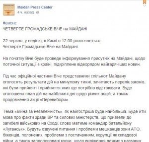 "Отдельной темой будет вынесен вопрос люстрации судей, состояние судебной системы сегодня и изменений в этой системе. Будет предоставлена информация о создании люстрационной базы чиновников, причастных к преступлениям против Майдана. Будет освещена тема подписания экономического блока с ЕС, вопросы и проблемы, которые ставятся перед нами в связи с этим. В последней официальной части дополнительно объявлено обо всех акциях, которые анонсированы во время Вече", - сообщается в сообщение пресс-центра Майдана в Fb.