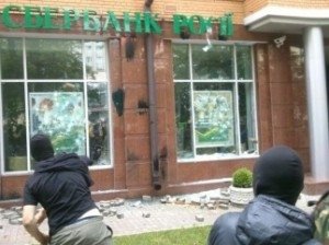 Вместе с тем, как рассказали агентству "Интерфакс-Украина" очевидцы происшествия, группа молодых людей в балаклавах, скрывающих лица, в воскресенье днем забросала камнями отделение "Сбербанка России".