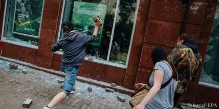 Вместе с тем, как рассказали агентству "Интерфакс-Украина" очевидцы происшествия, группа молодых людей в балаклавах, скрывающих лица, в воскресенье днем забросала камнями отделение "Сбербанка России".