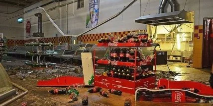 В супермаркет "Амстор", который расположен в Петровском районе Донецка, попали несколько снарядов, которые сильно повредили обшивку и пробили крышу.
