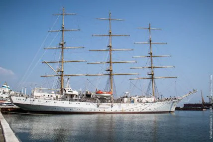 Трёхмачтовый фрегат построили на Гданьской судоверфи в 1987. Примерно в те же годы на воду было спущено ещё пять таких же кораблей. Судьба разбросала их по всей Евразии - от Гдыни до Владивостока. Второй украинский парусник, точь-в-точь такой же, стоит в Керчи. И точно также уже долгие годы не отходит от причала.