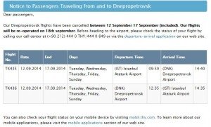 Turkish Airlines временно отменила рейсы до/из Днепропетровска с 12 сентября до 17 сентября (включительно) из-за ситуации в украинском воздушном пространстве. Рейсы будут возобновлены 18 сентября. Компания рекомендует пассажирам  проверить статус их рейса, позвонив в колл-центр или в режиме онлайн на официальном сайте Turkish Airlines