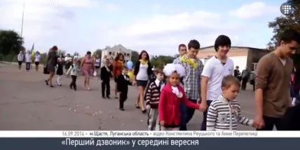 Громадське ТБ. Мы побывали на празднике первого звонка в счастьинской средней школе №56. Еще в понедельник саперы вели работы во дворе здания начальной школы, где в ночь со второго на третье разорвалось шесть фугасных снарядов. Всю ночь вокруг Счастья раздавались автоматные и пулеметные очереди, гремели взрывы гранат. А во вторник 450 школьников выстроились на праздничной линейке. Праздник получился простым и трогательным. После линейки занятия открылись уроком «Україна – єдина країна». Мы пообщались со школьниками и их учителями. Много говорили о войне, от которой все устали и причин которой никто из них не понимает. Говорили о жизни в «прифронтовом» городе, где бюджетники и пенсионеры уже почти 2 месяца не получают пенсий и зарплат, который обстреливается из всех видов оружия. О надеждах на мир. О нем здесь мечтают все - от учеников младших классов до директора школы.