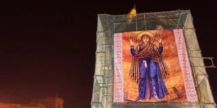 Баннер с изображением Богородицы установлен прямо на строительных лесах, ограждающих постамент.