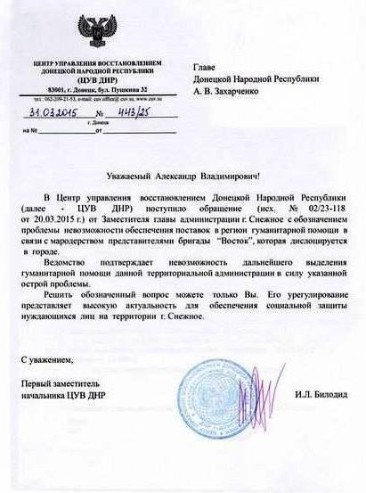 По словам работников "ЦУВ ДНР", "военнослужащие "Востока", которые дислоцируются на территории Снежного, промышляют грабежами гуманитарных грузов".