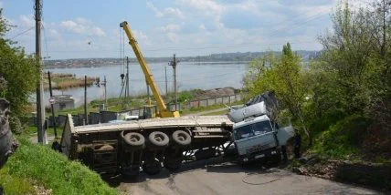"В Ленинском районе Николаева перевернулся груженный металлическим профилем КамАЗ. ДТП произошло на Паромном спуске, который более известен жителям Николаева как Аляудский спуск. КамАЗ с прицепом двигался по ул. 2-я Набережная в сторону ул. 1-я Ингульская. Когда автомобиль выехал на Аляудский спуск, произошли какие-то механические неполадки, и водитель вынужден был остановиться. Однако грузовик внезапно покатился вниз со спуска и на зауженном участке дороги перевернулся. Вернее, перевернулся только прицеп. Сам же тягач застрял между прицепом и возвышенной обочиной. Кроме того, один из бортов прицепа вырвало, и весь металлический профиль вывалился на дорогу", - говорится в сообщении.