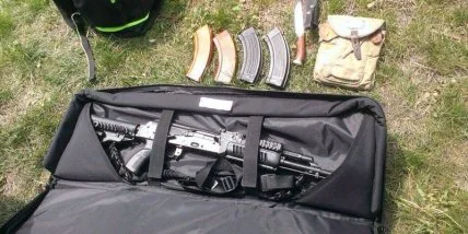 При осмотре автомобиля правоохранители обнаружили и изъяли 640 патронов калибра 7,62 мм к автомату Калашникова и 2 нарезных карабина и магазин с 23 патронами в багажнике автомобиля между хозяйственными сумками и личными вещами. Кроме того, в автомобиле были обнаружены автомат ММГ АКСУ КМС калибра 7,62 мм и нож с длиной лезвия 17 см.