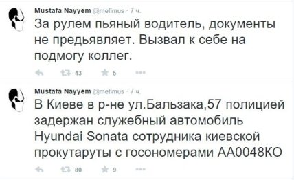 Как написал нардеп в воскресенье в своем аккаунте в Twitter, автомобиль Hyundai Sonata зарегистрирован как служебный транспорт прокуратуры г.Киева. "За рулем пьяный водитель, документы не предъявляет. Вызвал к себе на подмогу коллег", - отметил М.Найем и обнародовал государственные нормерные знаки автотранспорта.