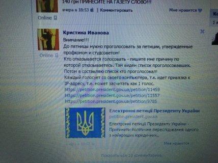 "Внимание! До пятницы надо проголосовать за петиции, утвержденные профкомом и студсоветом! Кто отказывается голосовать - пишите мне причину, по которой отказываетесь. Там видно список тех, кто проголосовал. Потом я составлю список - кто не проголосовал. Каждый голосует со своего компьютера, поскольку идет привязка к IP-адресу, то есть можно засчитать как один голос", наводит топ-блогер Бигдан копию страницы соцсети в подтверждение скандального факта. Некоторые студенты-активисты делают репосты обращения, а автор "Живого журнала" представляет тексты петиций, за которые якобы заставляют голосовать студентов одесского вуза.