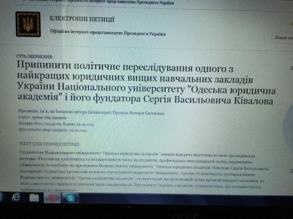В частности, "Прекратить политическое преследование одного из лучших юридических высших учебных заведений Украины Национального университета "Одесская юридическая академия" и его основателя Сергея Васильевича Кивалова" (автор Валерия Прущак).