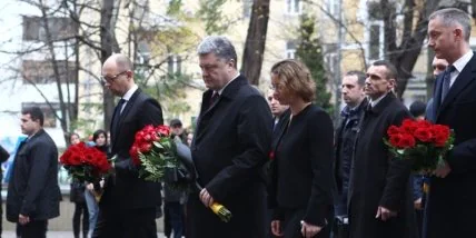 К диппредставительству на ул. Рейтарской в субботу утром прибыли президент Украины Петр Порошенко, премьер-министр Украины Арсений Яценюк и члены правительства. Они возложили цветы возле здания посольства.