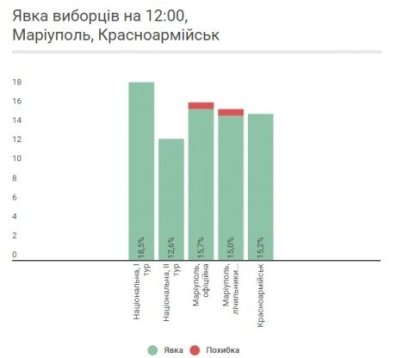 На местных выборах в Мариуполе и и Красноармейске явка избирателей по состоянию на 12:00 составляет 15% и 15,2% соответственно.