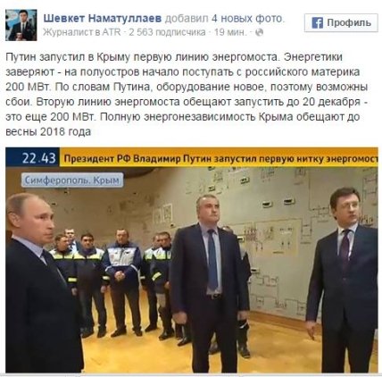 "В мае - я просил бы вас сделать это как можно быстрее - до начала и даже до подготовки к летнему сезону, чтобы было еще четыреста (МВт электроэнергии в Крыму - ред). И таким образом мы полностью бы заместили подачу электроэнергии с Украины целиком, и даже чуть больше бы у нас получилось", - сказал В.Путин в ходе запуска цепи энергомоста в Крым.