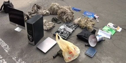По подозрению в причастности к совершению ограбления с проникновением в помещение работники полиции задержали 46-летнего жителя Кировоградской области. Во время обыска транспортного средства следственно-оперативная группа изъяла несколько компьютеров, ножи, два устройства для отстрела патронов, снаряженных резиновыми пулями, патроны к ним, бронежилет, громкоговоритель, несколько раций, радиостанцию, удостоверение журналиста, а также устройство для курения и два стакана с неизвестной смесью (один - с травяной, другой - с порошкообразными веществами).