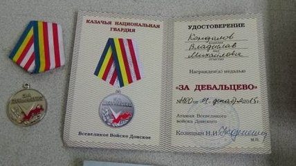За участие в боевых действиях против украинских подразделений террористы наградили российского наемника фейковой медалью "За Дебальцево" и памятным знаком"Участник боевых действий".