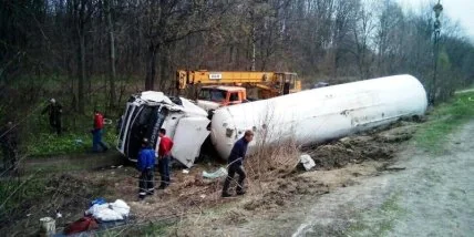 По предварительным данным, водитель грузовика с цистерной не справился с управлением и съехал на обочину, где транспортное средство перевернулось.