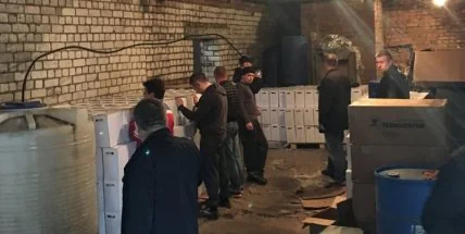 Сотрудники Государственной фискальной службы Украины в заброшенной складском помещении в одном из сел вблизи Чернигова обнаружили мощный подпольный цех, в котором путем смешивания неучтенного спирта с водой изготавливалась так называемая "водка".