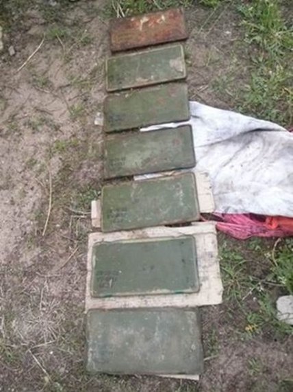 Согласно ст. 263 УК правоохранители провели обыск в квартире правонарушителя. На приусадебном участке оперативники обнаружили тайник, из которого изъяли семь элементов 4С20 комплект навесной динамической защиты танков (содержат пластическое взрывчатое вещество ПВВ-5А, основной составляющей которой является гексоген), четыре гранаты Ф-1 и РГД-5 с запалами, патроны калибра 7,62 мм.