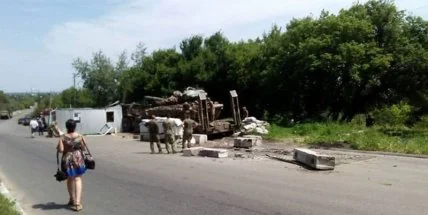Как сообщалось ранее, военный тягач врезался в блокпост. Тягач перевозил танк, и у него отказали тормоза на спуске на Пролетарском мосту и он протаранил блокпост.