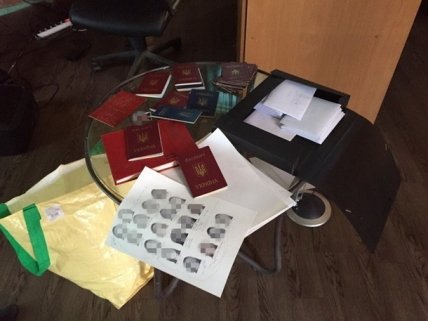 "Во время обыска в доме одного из злоумышленников правоохранители изъяли оборудование, оргтехнику и другое орудие, которое использовалось для изготовления фальшивых документов, а также 50 готовых паспортов с признаками и элементами подделки", - говорится в сообщении пресс-центра СБ Украины, обнародованном в четверг.
