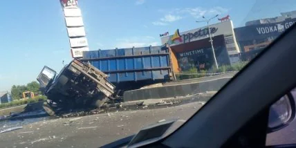 В Киеве на проспекте Бажана на подъезде к Южному мосту произошло ДТП, в результате которого перевернулась фура.