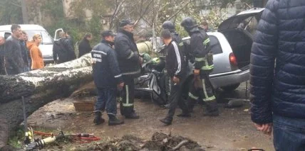 В результате сильного ветра с утра в городе падают деревья, упало два подъемных крана. В результате падения деревьев погибла 79-летняя женщина и серьезно пострадал 48-летний мужчина.