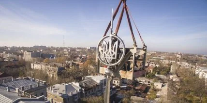 Сама металлическая стела, на вершине которой располагалась звезда, осталась, но в основе круга установили Герб Украины, изготовленный в аналогичных размерах. Как сообщили работники, которые осуществили демонтаж и установку герба, замена символики происходит по согласованию с мэром Николаева Александром Сенкевичем. Работы по изготовлению и установке трезубца проводились компанией "УкрБуд".
