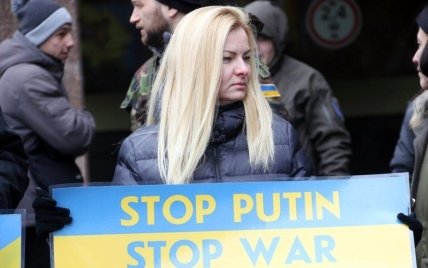 Участники акции держали в руках государственные и красно-черные флаги Украины, а также лозунги "Крым - это Украина!" и "Стоп Путин, стоп война!".