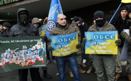 "Наши требования - вывести иностранные вооруженные формирования, военную технику и наемников с территории Украины под наблюдением ОБСЕ, разоружить незаконные группы и восстановить контроль над государственной границей со стороны Украины, а также освободить заложников и незаконно удерживаемых лиц, находящихся под арестом по политически мотивированным и сфабрикованным обвинениям", - заявил один из организаторов акции - лидер организации "Правый Сектор" Сергей Стерненко.