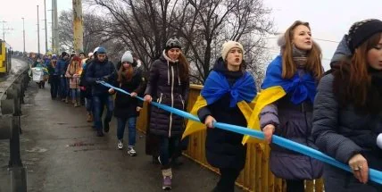 В Виннице активисты выстроились в "цепи единения" на центральном мосту через реку Южный Буг, символически соединив восточный и западный берега в честь Дня соборности Украины.