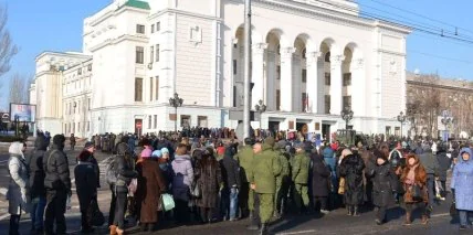 Возле здания собрались около тысячи человек, движение в центре оккупированного Донецка перекрыто, на улицах за порядком следят так называемые "правоохранители ДНР". В конце церемонии гроб с телом "Гиви" планируют провезти на пушечном лафете центральными улицами города. В сети сообщают, что на церемонию прощания согнали бюджетников и студентов.