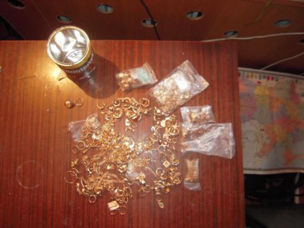 Работники таможни обнаружили в салоне автомобиля около 1 килограмма 200 граммов изделий из желтого металла, внешне похожего на золото. Ювелирные изделия находились без признаков сокрытия в салоне автомобиля между сиденьями в банке из-под кофе и россыпью в полиэтиленовых пакетах.