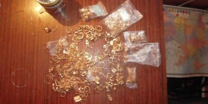 Работники таможни обнаружили в салоне автомобиля около 1 килограмма 200 граммов изделий из желтого металла, внешне похожего на золото. Ювелирные изделия находились без признаков сокрытия в салоне автомобиля между сиденьями в банке из-под кофе и россыпью в полиэтиленовых пакетах.