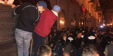 Вчерашняя акция протеста в начале носила мирный характер - люди держали в руках плакаты и провозглашали протестные лозунги. Однако вскоре все перешло на радикальные действия - люди начали беспощадно громить металлические плиты, которыми накануне была замурована арка.