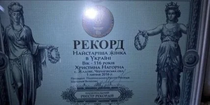 В марте нынешнего года 116-летнюю Христинию Нагорную занесли в Национальную книгу рекордов , как самую старую женщину в Украине. В то же время она входит в пятерку старейших женщин планеты. Кроме нее, в нем - итальянка Эмма Морено (117 лет), жительница Ямайки Вайолет Браун (117), японка Наби Таджима (116) и японка Тие Мийако (115).