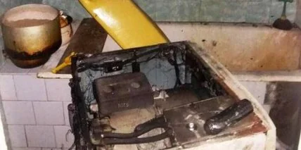 Работники полиции при осмотре места происшествия обнаружили обугленную бытовую технику - стиральную машину. Причины взрыва устанавливаются.