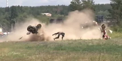 На кадрах видно, как мотоциклы сталкиваются на повороте, а затем мотоциклисты вылетают из-за руля и делают несколько переворотов через голову по траве, а за ними летят их транспортные средства.