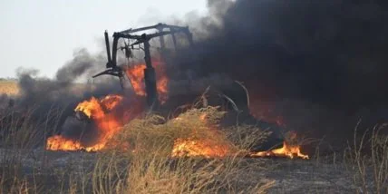 Новенький голландский трактор New Holland полностью сгорел. Такая же участь едва не постигла автоцистерну Iveco — водитель успел увести автомобиль буквально в последнюю секунду.