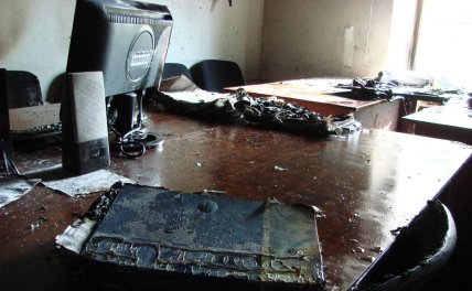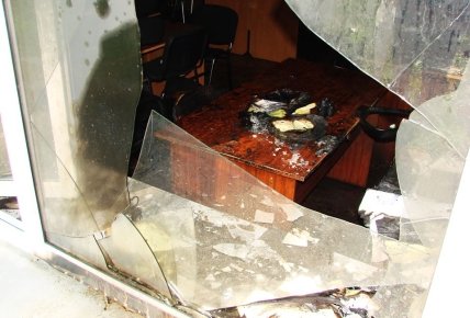 Согласно фотографиям, которые А.Андреев также обнародовал в Фейсбук, в помещении разбиты окна, на стенах видны следы пожара, а на столах - сгоревшие бумаги. По его словам, повреждена офисная мебель и офисная техника, а государственный флаг не сгорел.