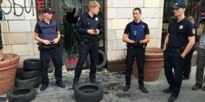 У входной двери в магазин разбито стекло, а возле неё лежат горящие шины, витрины магазина расписаны.