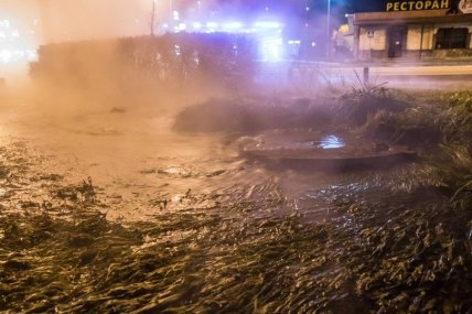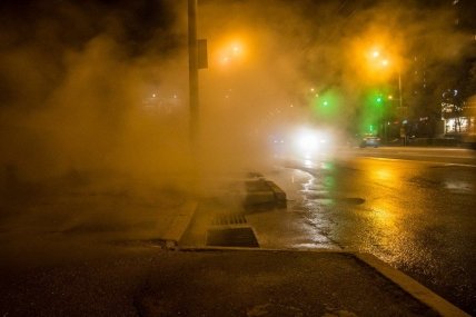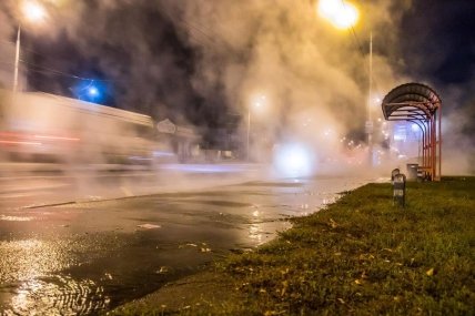 В результате прорыва часть проспекта залило водой из канализационного люка. От горячей воды в воздух поднялся пар.